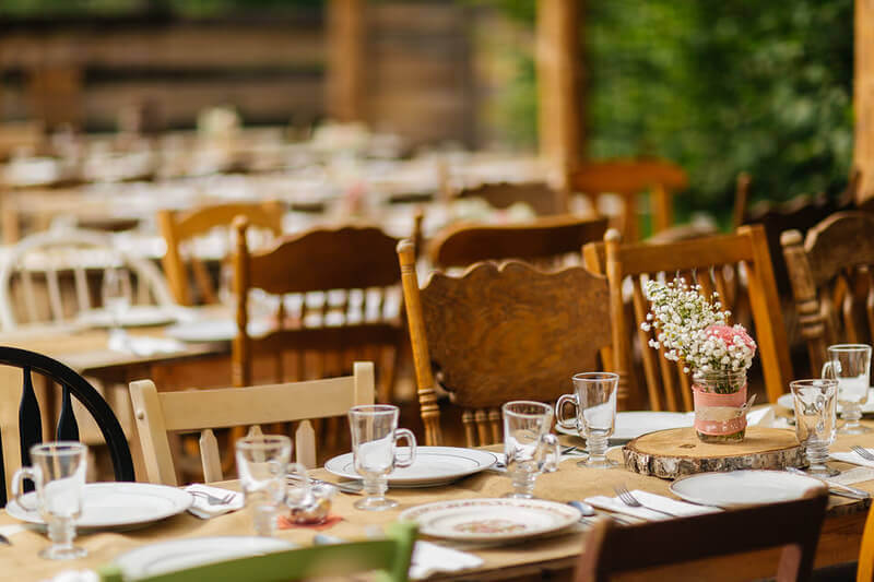 Most couples choose to hold the ceremony at Gloryview Farm outside on the beautiful grassy lawn in front of the rustic barn that is surrounded by lots of trees, greenery and beautiful weathered wood fences. The expansive lawn area is also a great spot for lawn games to entertain your guests before and during your event. After the ceremony, you and your guests can enjoy dinner in the light and open, beautiful covered log pavilion area. Your guests will be seated in our casual and cute mismatched wood chairs at our rustic harvest style tables.